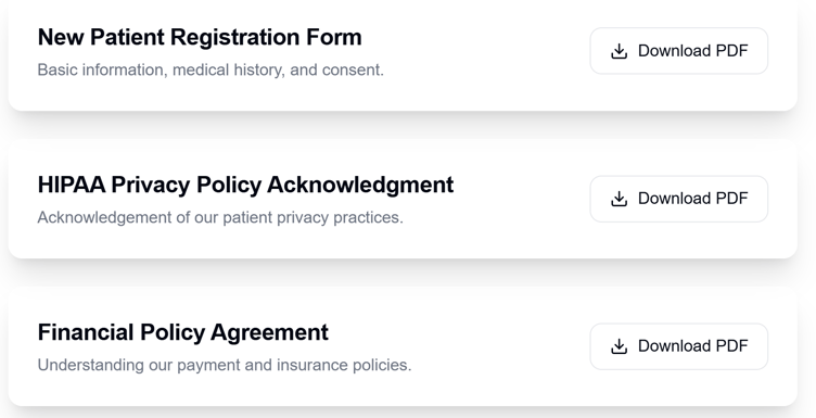Completing these forms prior to your visit helps us streamline the check-in process and ensures we have all the necessary information to provide you with the best possible care.